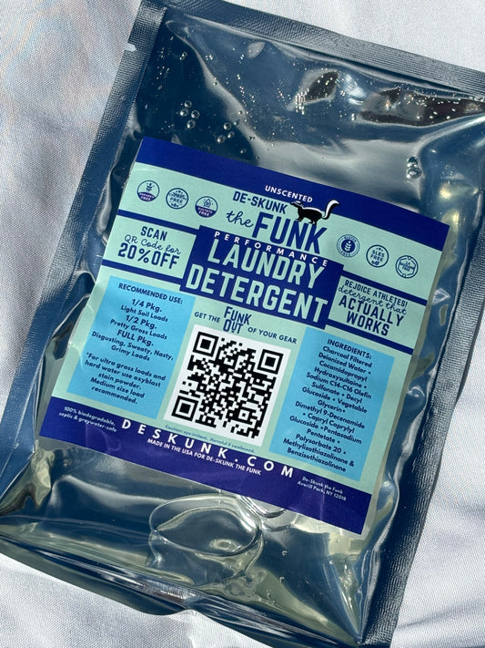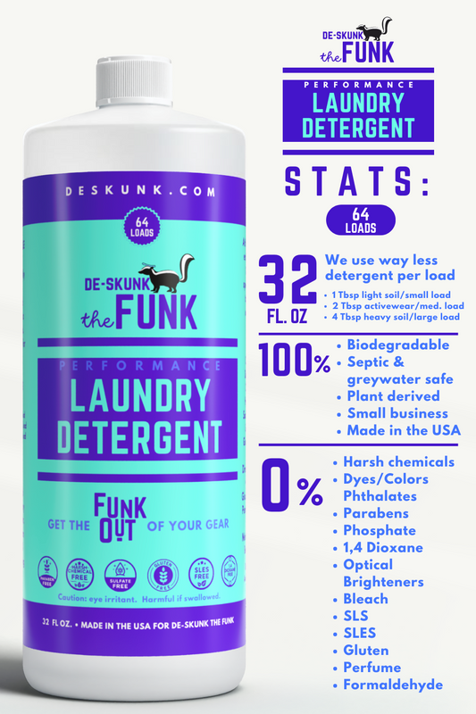 I've been there...I've spent years trying to find an answer to getting the sweaty smell out of my workout gear without all the harsh chemicals in detergents that say they clean athletic gear. Have you ever noticed that stains and smells aren't really removed, but masked with optical brighteners and powerful smells? What is really happening is harsh chemicals are being swished around with your clothes without actually removing the sweat, grime, and stench. Insted, the harmful chemical soup is giving the false impression that your clothes are clean, often times having loads of known carcinogens. Do you really want those chemicals lingering in your clothes touching your skin each day? Our detergent takes a different approach and actually strips away the dirt and odors. We don't add any fake chemical to give the false impression of clean laundry; instead, ours is genuinely clean. Why not pods or sheets? Even though they might be convenient, they use plastic that is actually dissolved into our water, causing further environmental problems. If you want truly clean workout gear without the harsh chemicals, De-Skunk the Funk is your brand.
